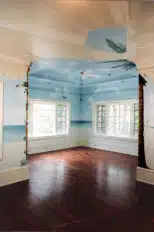 With the help of Jill Schultz McGannon, McKeithan created this desert island themed bedroom suite for a teenage boy. The suite adjoins “Underwater Bath.” A trompe l’oeil canvas “sail” from a shipwreck is painted to appear to stretch across the bed area of the suite, while the tranquil ocean surrounds the room. Details like frogs, fish, seagulls, parrots, hummingbird, and float keep one company on this pleasant island paradise.